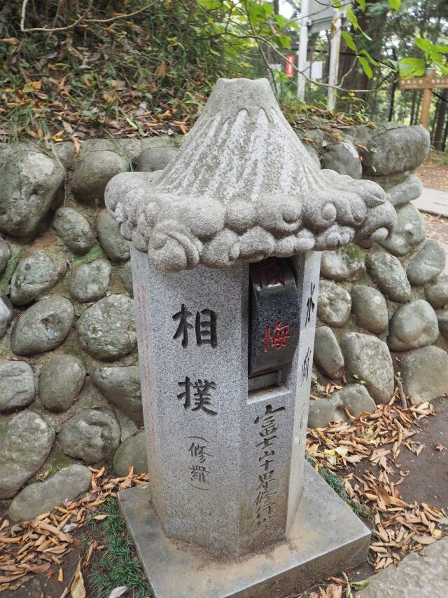 “心のふるさと、祈りのお山”と書かれた石碑。