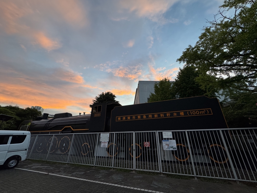 機関車の形をしたこの展示物は、緊急時の飲料貯水槽だそうです。