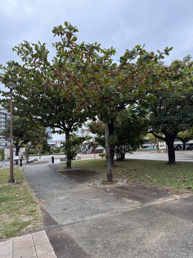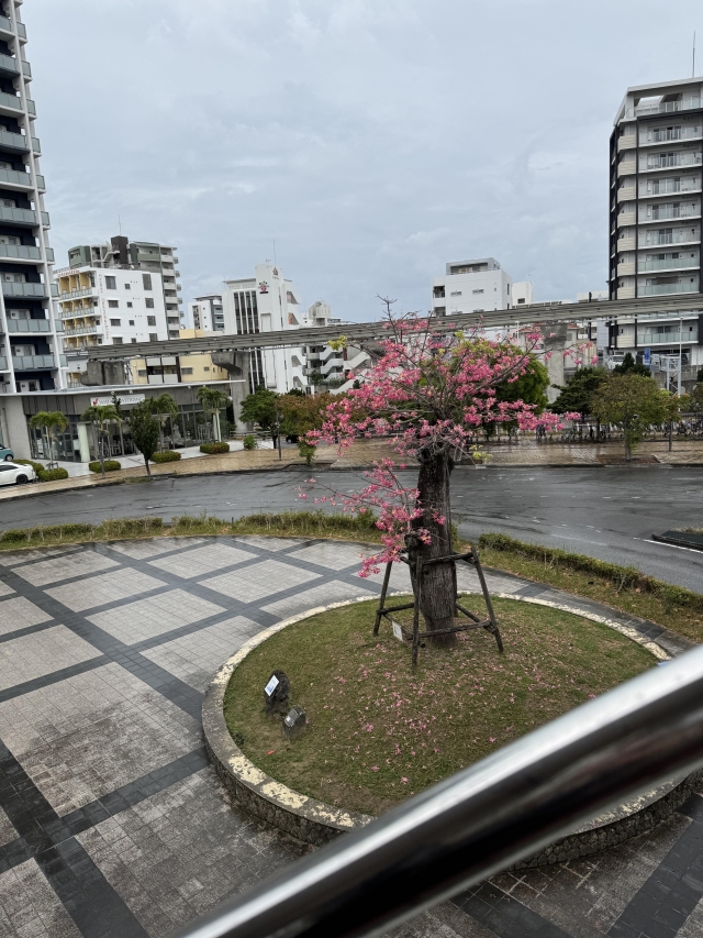 このおもろまち駅の歩道橋に行くときにいつも見える木が、たぶんカンボジアで見た桜に似ているなーって思った花の木。