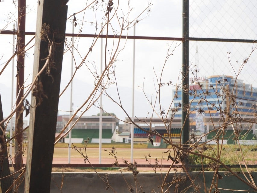 ピント、手前の枯れ草に合っちゃってますけど、奥にグラウンドや客席が見えるでしょうか?あれです。